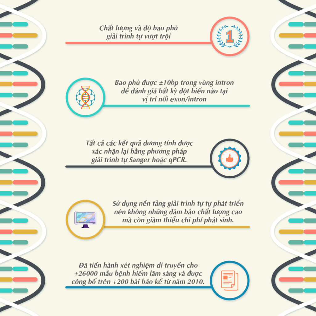 - Xét nghiệm bao gồm giải trình tự lại và giải trình tự denovo toàn bộ 180.000 exon của hơn 22.000 gene nhằm phát hiện biến thể di truyền gây bệnh: đột biến điểm, các mất đoạn, thêm đoạn, chèn đoạn nhỏ (<20bp)