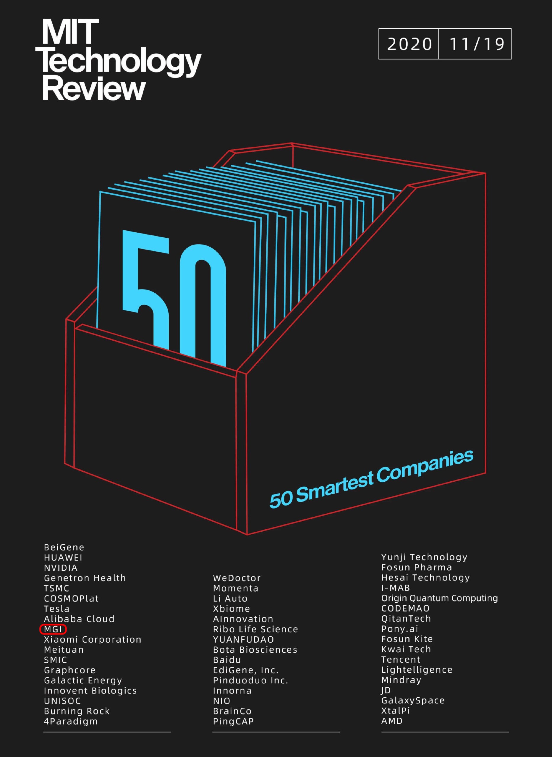 Ngày 19 tháng 11, MGI đã được tạp chí MIT Technology Review (ấn phẩm công nghệ lâu đời nhất thế giới) vinh danh là một trong 50 công ty thông minh nhất năm 2020.